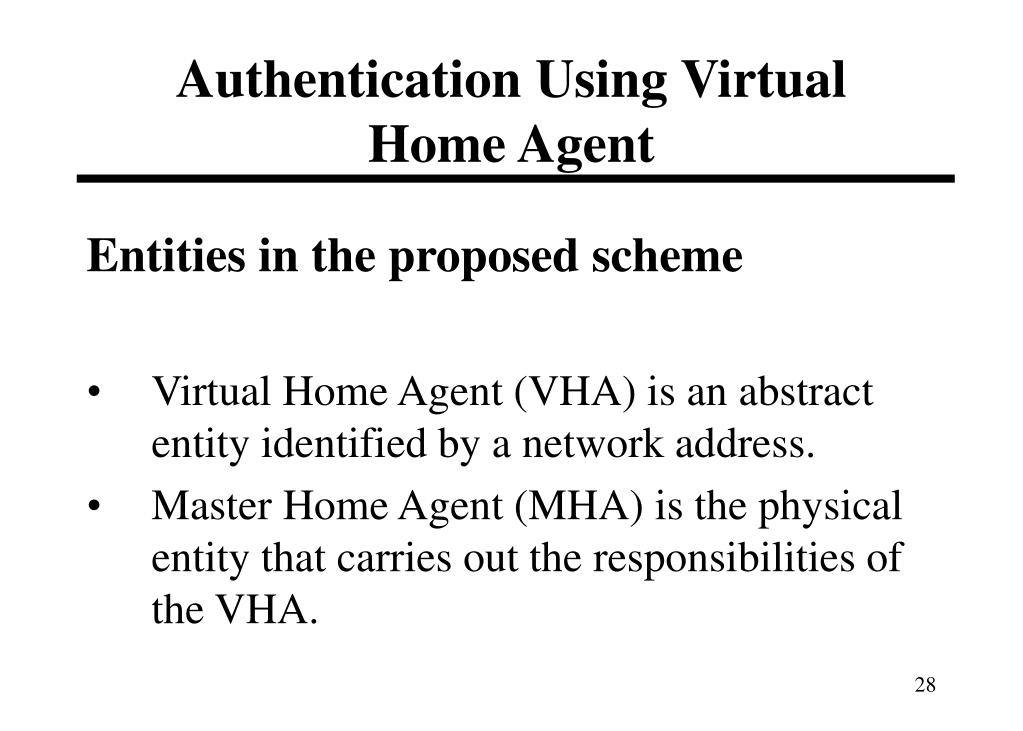 Authentication Using Virtual Home Agent Entities in the proposed scheme • Virtual Home Agent (VHA) is an abstract entity identified by a network address. • Master Home Agent (MHA) is the physical entity that carries out the responsibilities of the VHA.