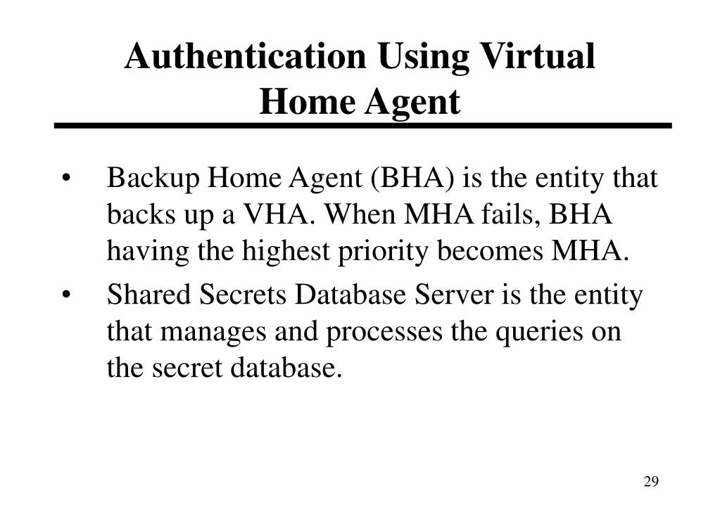 Authentication Using Virtual Home Agent • Backup Home Agent (BHA) is the entity that backs up a VHA. When MHA fails, BHA having the highest priority becomes MHA. • Shared Secrets Database Server is the entity that manages and processes the queries on the secret database.