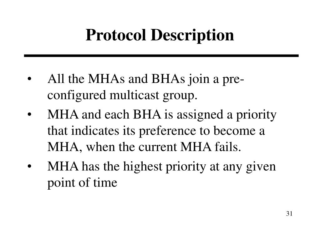 Protocol Description • All the MHAs and BHAs join a pre-configured multicast group. • MHA and each BHA is assigned a priority that indicates its preference to become a MHA, when the current MHA fails. • MHA has the highest priority at any given point of time