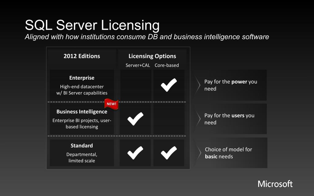SQL Server LicensingAligned with how institutions consume DB and business intelligence software 2012 Editions Licensing Options Server+CAL Core-based Enterprise High-end datacenter w/ BI Server capabilities Pay for the poweryou need NEW! Business Intelligence Enterprise BI projects, user-based licensing Pay for the usersyou need Choice of model for basic needs Standard Departmental, limited scale