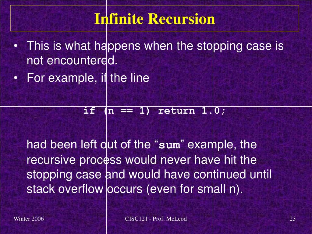 Infinite Recursion • This is what happens when the stopping case is not encountered. • For example, if the line if (n == 1) return 1.0; had been left out of the “sum” example, the recursive process would never have hit the stopping case and would have continued until stack overflow occurs (even for small n). CISC121 - Prof. McLeod
