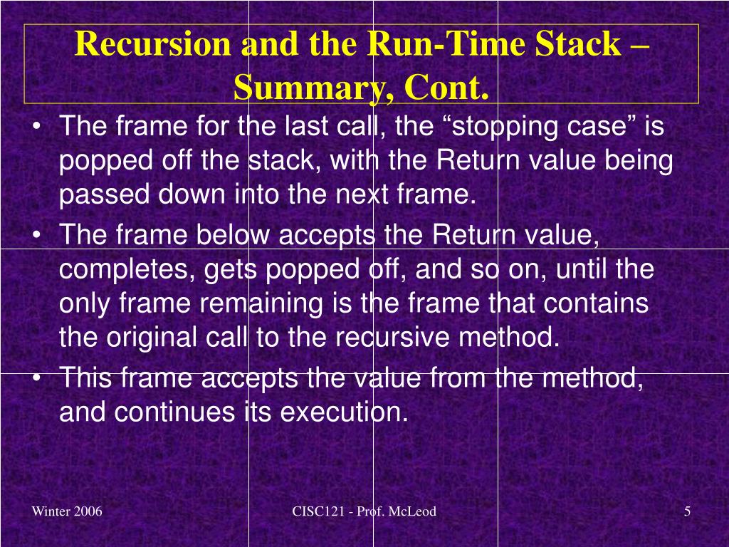 Recursion and the Run-Time Stack – Summary, Cont. • The frame for the last call, the “stopping case” is popped off the stack, with the Return value being passed down into the next frame. • The frame below accepts the Return value, completes, gets popped off, and so on, until the only frame remaining is the frame that contains the original call to the recursive method. • This frame accepts the value from the method, and continues its execution. CISC121 - Prof. McLeod