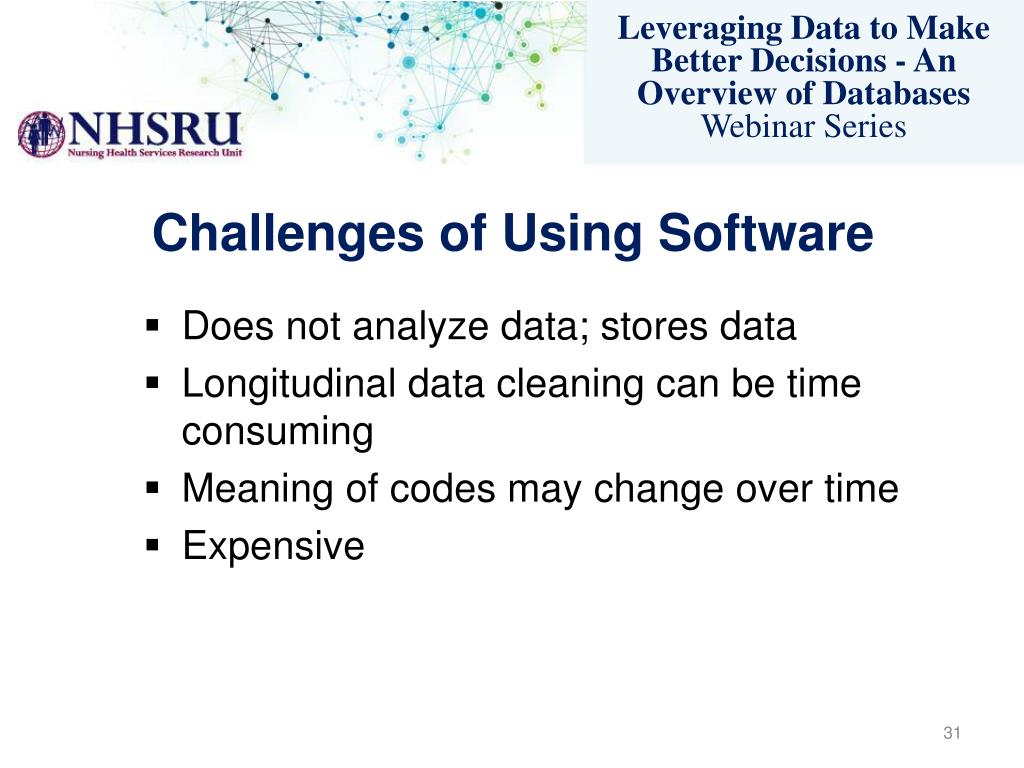 Challenges of Using Software • Does not analyze data; stores data • Longitudinal data cleaning can be time consuming • Meaning of codes may change over time • Expensive