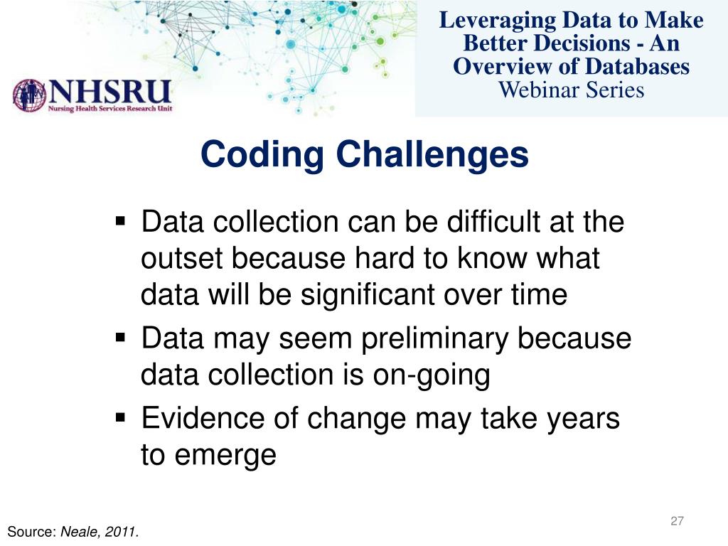 Coding Challenges • Data collection can be difficult at the outset because hard to know what data will be significant over time • Data may seem preliminary because data collection is on-going • Evidence of change may take years to emerge Source: Neale, 2011.