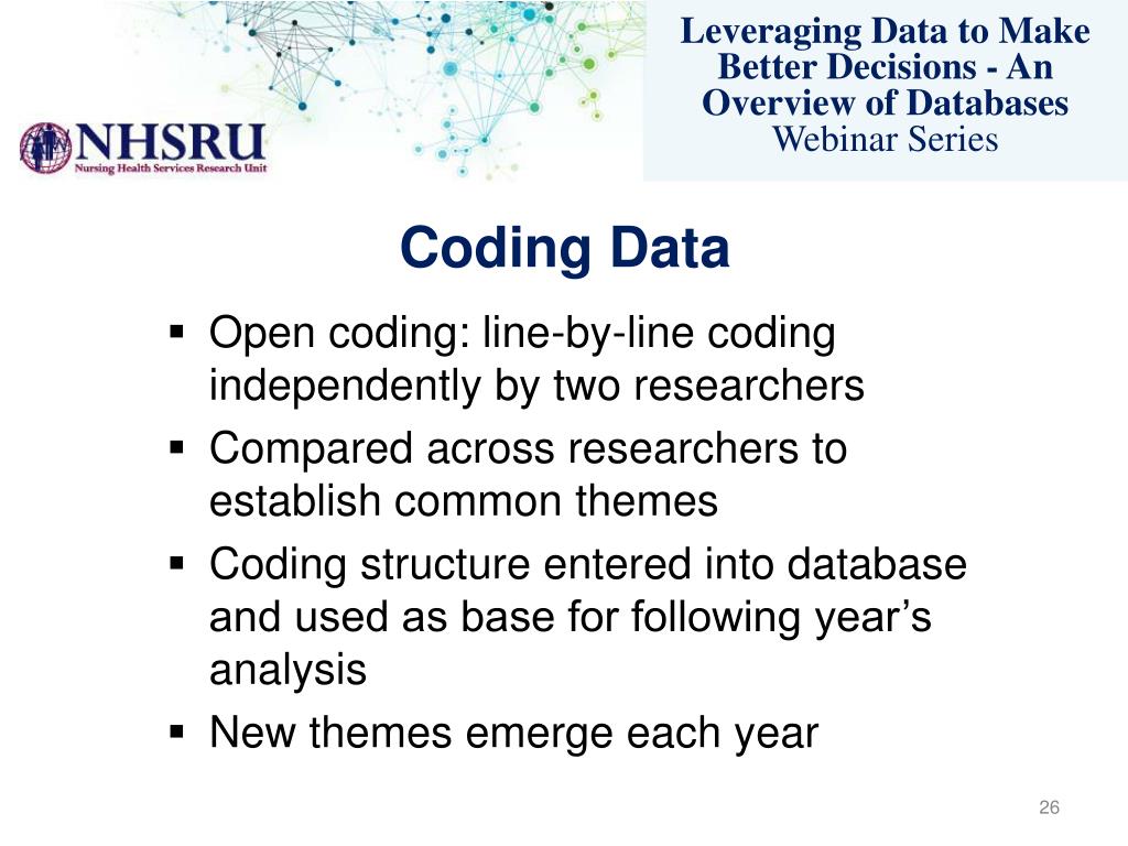 Leveraging Data to Make Better Decisions - An Overview of Databases Webinar Series . Webinar 6: Development of a Longitudinal Qualitative Database. Mary Crea-Arsenio MSc. Andrea Baumann RN, PhD Mabel Hunsberger RN, PhD Nursing Health Services Research Unit (NHSRU) McMaster University .