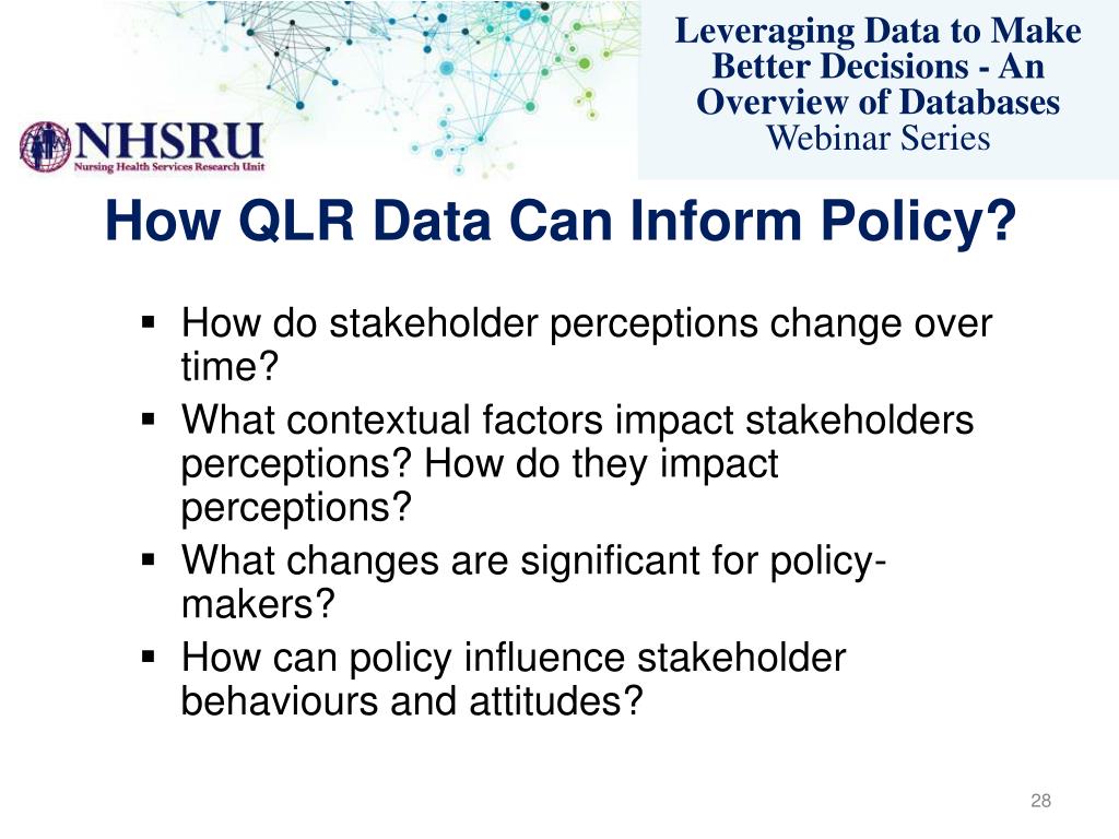 How QLR Data Can Inform Policy? • How do stakeholder perceptions change over time? • What contextual factors impact stakeholders perceptions? How do they impact perceptions? • What changes are significant for policy-makers? • How can policy influence stakeholder behaviours and attitudes?