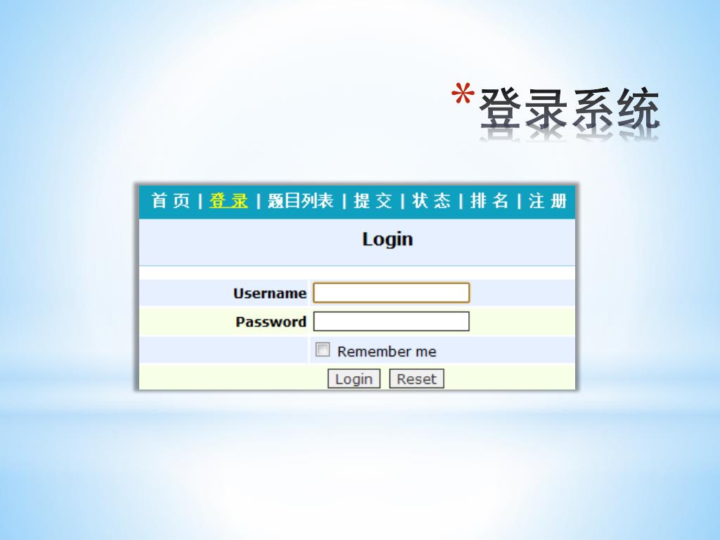 调查: 有多少同学用过OJ(WOJ/POJ…)? • Online Judge(ACM/ICPC),在线评测系统 • WOJ= Whu OJ • 现有系统(展示): • Land http://acm.whu.edu.cn/land • 原始系统,ACM训练用,主要是英文题面描述 • Learn http://acm.whu.edu.cn/learn • 改造系统,程序设计训练课程使用,有难度标识,题目同Land • Starter http://acm.whu.edu.cn/starter • 供初学者使用,中文题面,低难度 OJ简介