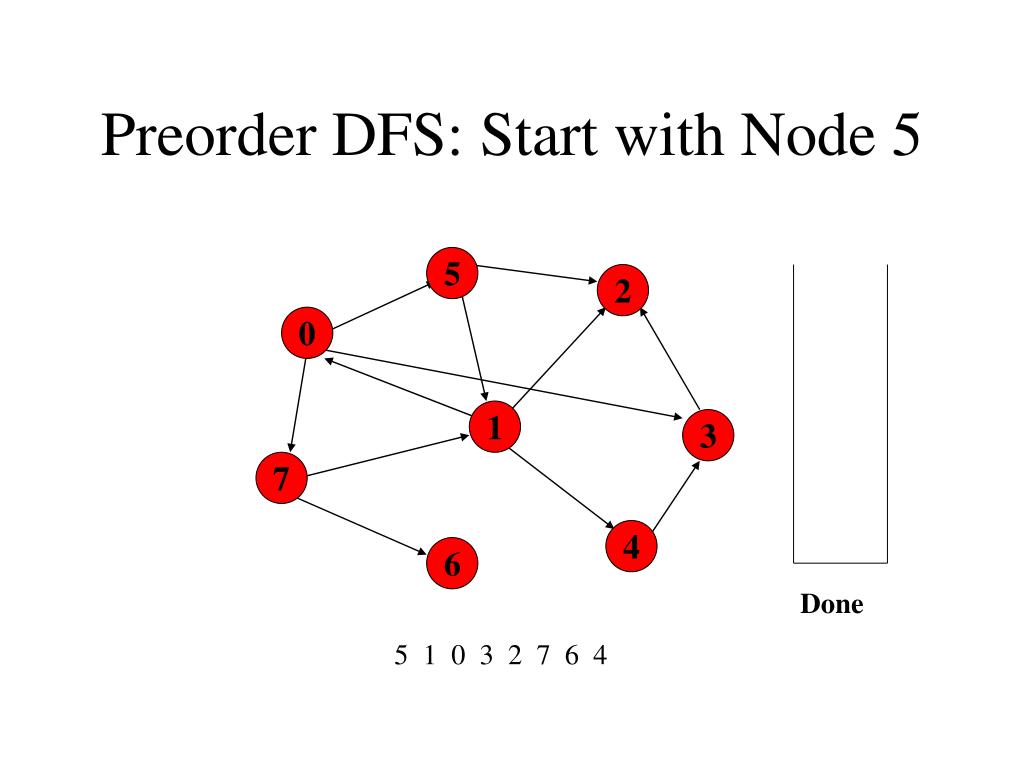Preorder DFS: Start with Node 5 5 2 0 1 3 7 4 6 Done 5 1 0 3 2 7 6 4