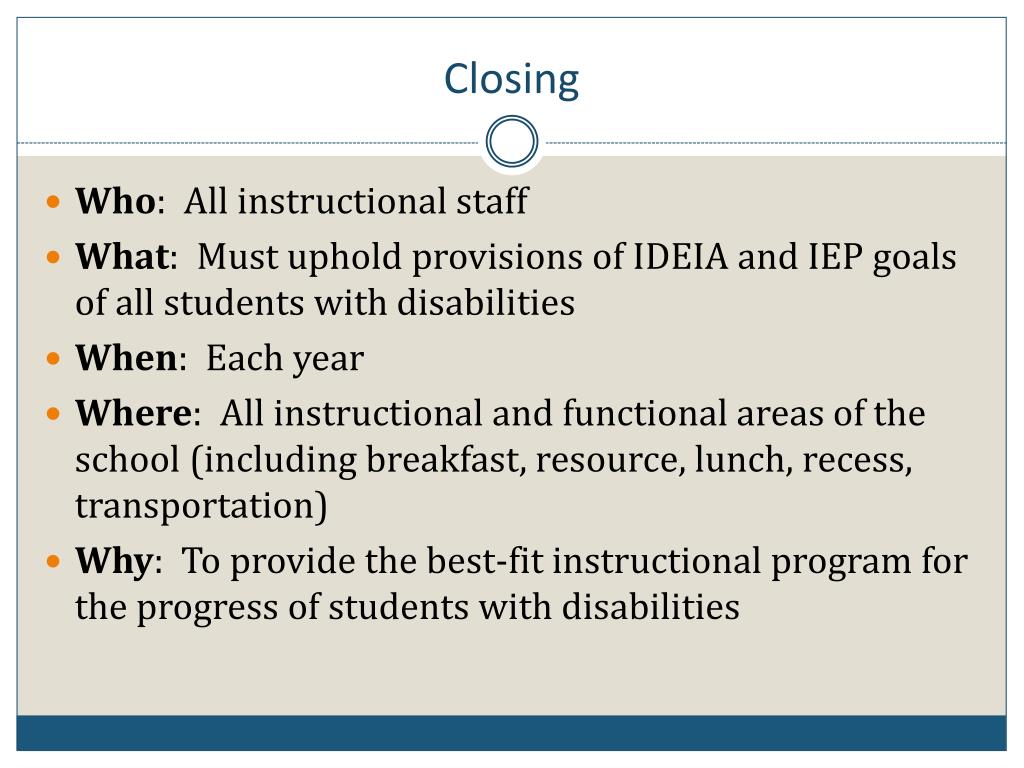Closing Who: All instructional staff What: Must uphold provisions of IDEIA and IEP goals of all students with disabilities When: Each year Where: All instructional and functional areas of the school (including breakfast, resource, lunch, recess, transportation) Why: To provide the best-fit instructional program for the progress of students with disabilities