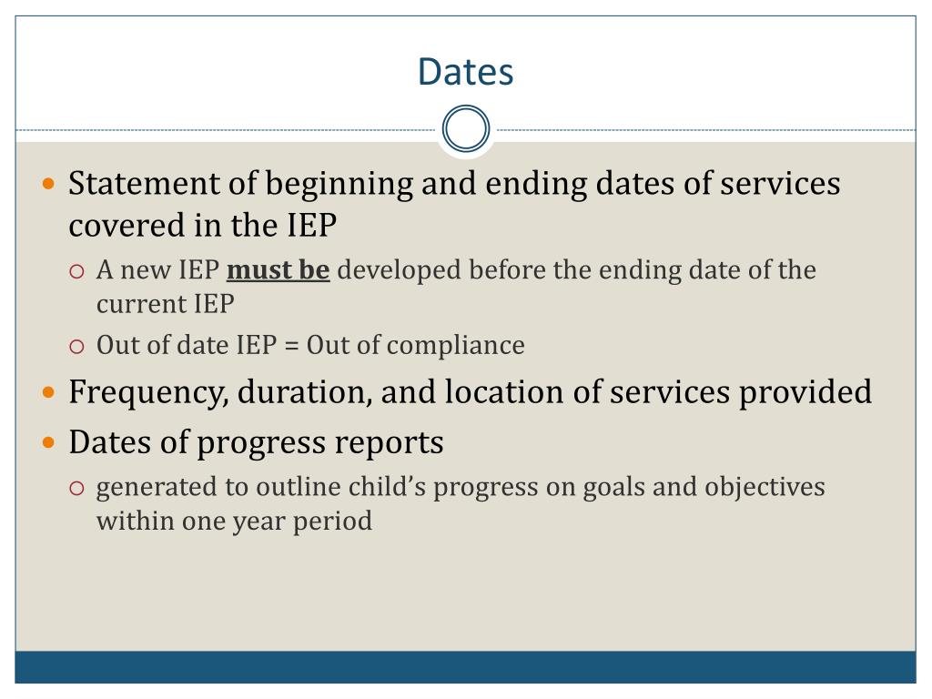 Dates • Statement of beginning and ending dates of services covered in the IEP • A new IEP must bedeveloped before the ending date of the current IEP • Out of date IEP = Out of compliance • Frequency, duration, and location of services provided • Dates of progress reports • generated to outline child’s progress on goals and objectives within one year period