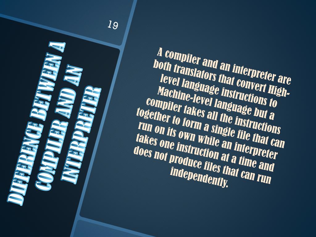 A compiler and an interpreter are both translators that convert High-level language instructions to Machine-level language but a compiler takes all the instructions together to form a single file that can run on its own while an interpreter takes one instruction at a time and does not produce files that can run independently. DIFFERENCE BETWEEN A COMPILER AND AN INTERPRETER