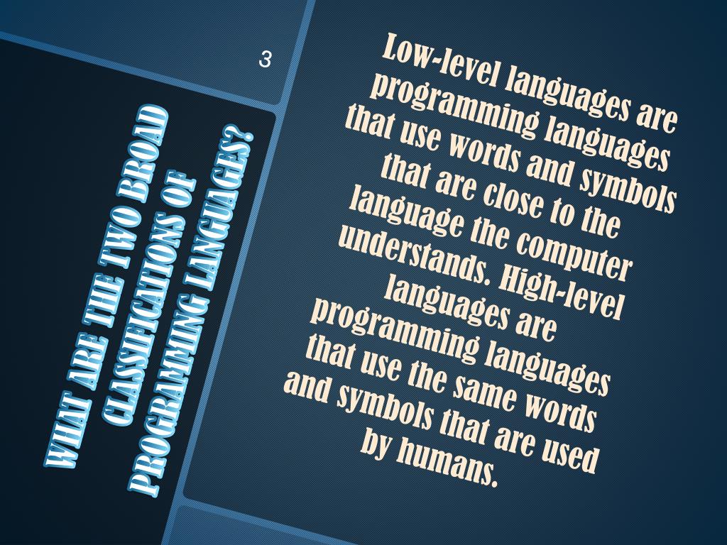 Low-level languages are programming languages that use words and symbols that are close to the language the computer understands. High-level languages are programming languages that use the same words and symbols that are used by humans. WHAT ARE THE TWO BROAD CLASSIFICATIONS OF PROGRAMMING LANGUAGES?