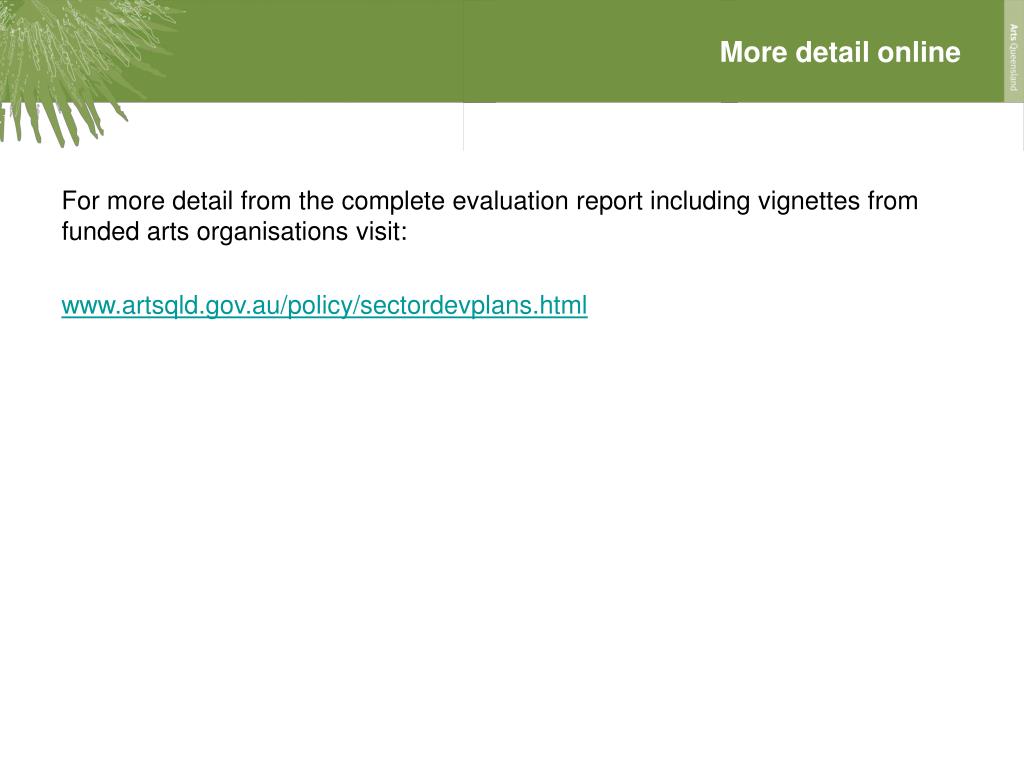 More detail online For more detail from the complete evaluation report including vignettes from funded arts organisations visit: www.artsqld.gov.au/policy/sectordevplans.html