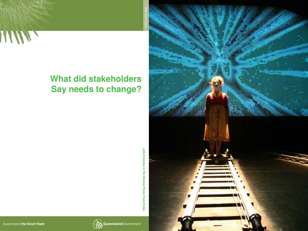 Sector feedback On clarifying Arts Queensland’s role“Stakeholders said:” • Need for Arts Queensland to clearly explain its role as: • funder • partner • advocate • government interpreter for the arts and cultural sector Clarify Arts Queensland’s capacityto undertake and share findings of: • strategic research • data analysis • evaluation