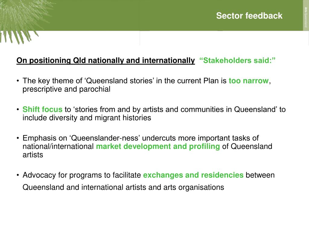 Sector feedback On positioning Qld nationally and internationally“Stakeholders said:” • The key theme of ‘Queensland stories’ in the current Plan is too narrow, prescriptive and parochial • Shift focus to ‘stories from and by artists and communities in Queensland’ to include diversity and migrant histories • Emphasis on ‘Queenslander-ness’ undercuts more important tasks of national/international market development and profiling of Queensland artists • Advocacy for programs to facilitate exchanges and residencies between Queensland and international artists and arts organisations
