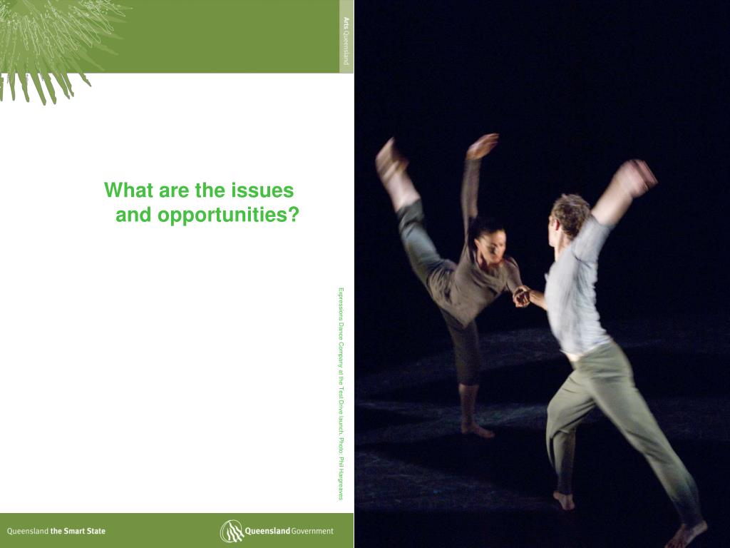 Sector feedback On arts and culture in regional Queensland“Stakeholders said:” • There is a need for strong partnerships to enhance support and service delivery in regional, rural and remote Queensland • Issues and opportunities identified included: • need for improved information sharing on funding opportunities and services • improving artists’ access to professional development and networking • need to build local community capacity to support arts and cultural development • support for and skilling of volunteers
