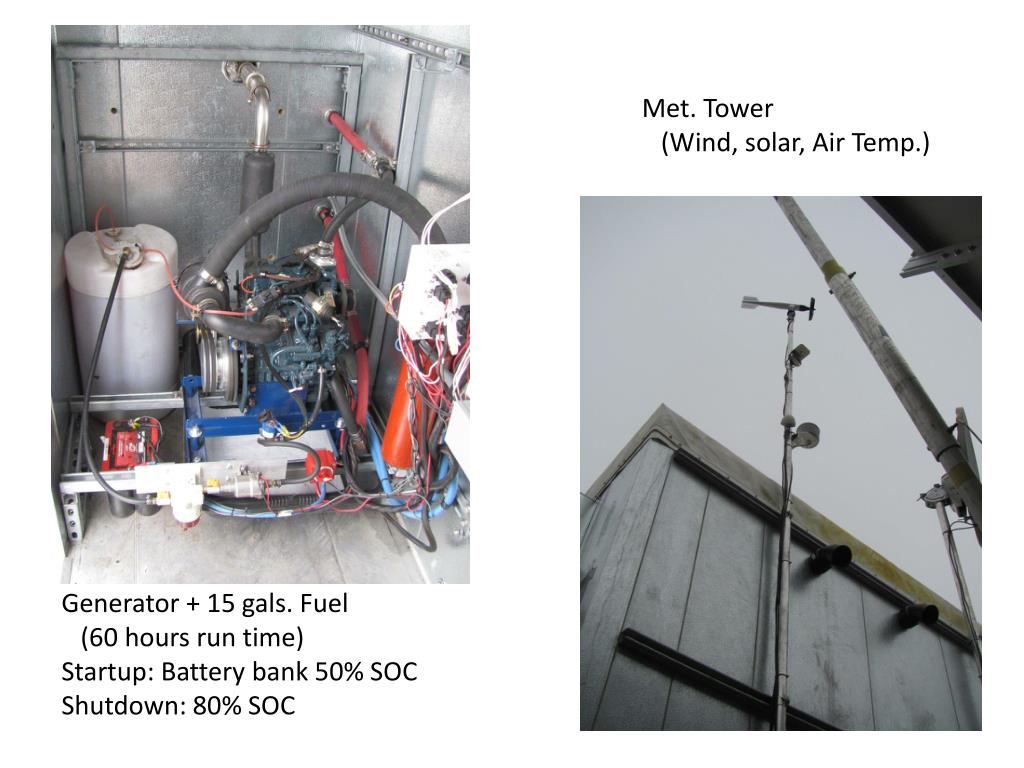 Met. Tower (Wind, solar, Air Temp.) Generator + 15 gals. Fuel (60 hours run time) Startup: Battery bank 50% SOC Shutdown: 80% SOC