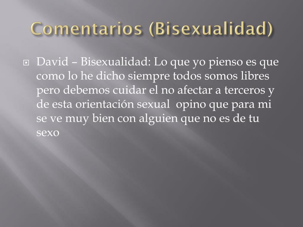 Comentarios (Bisexualidad) • David – Bisexualidad: Lo que yo pienso es que como lo he dicho siempre todos somos libres pero debemos cuidar el no afectar a terceros y de esta orientación sexual opino que para mi se ve muy bien con alguien que no es de tu sexo