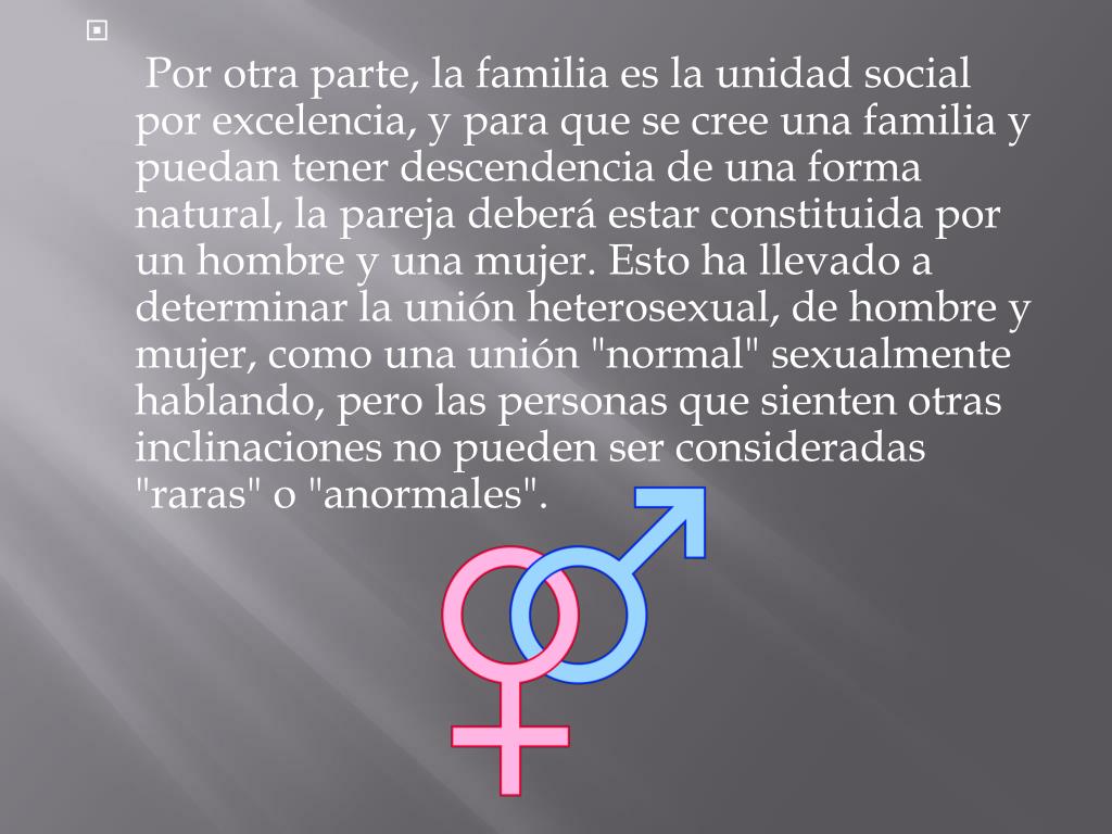 Por otra parte, la familia es la unidad social por excelencia, y para que se cree una familia y puedan tener descendencia de una forma natural, la pareja deberá estar constituida por un hombre y una mujer. Esto ha llevado a determinar la unión heterosexual, de hombre y mujer, como una unión "normal" sexualmente hablando, pero las personas que sienten otras inclinaciones no pueden ser consideradas "raras" o "anormales".