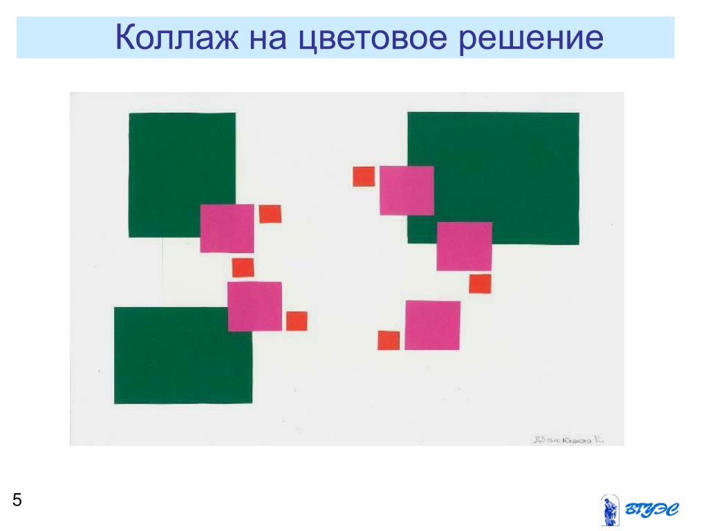 Словарь • Коллаж (от фр. papier collée -наклеенная бумага) - творческий жанр, когда произведение создаётся из вырезанных самых разнообразных изображений, наклеенных на бумагу, холст. Яркое и выразительное представление идеи. • Коллаж может быть дорисованным любыми другими средствами ― тушью, акварелью и т. д. 4