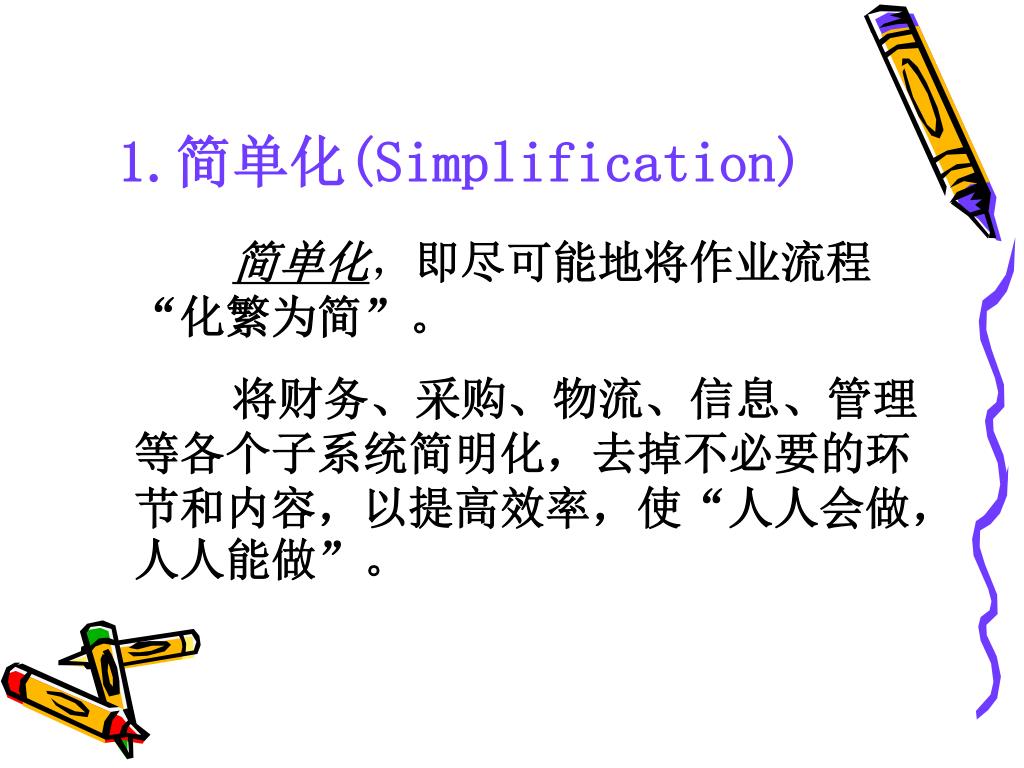 1.简单化(Simplification) 简单化,即尽可能地将作业流程“化繁为简”。 将财务、采购、物流、信息、管理等各个子系统简明化,去掉不必要的环节和内容,以提高效率,使“人人会做,人人能做”。