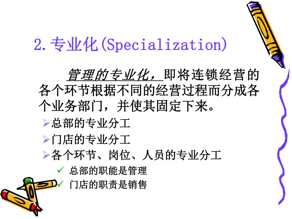 2.专业化(Specialization) 管理的专业化,即将连锁经营的各个环节根据不同的经营过程而分成各个业务部门,并使其固定下来。 • 总部的专业分工 • 门店的专业分工 • 各个环节、岗位、人员的专业分工 • 总部的职能是管理 • 门店的职责是销售
