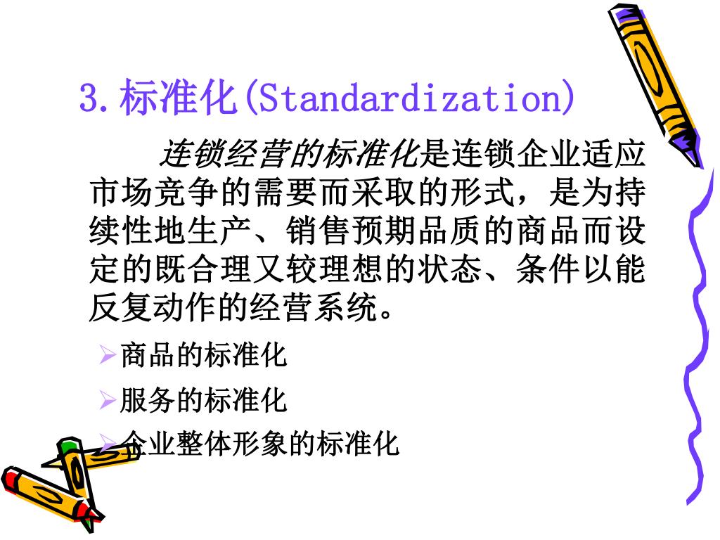 三、连锁经营的“三S原则” • 简单化(Simplification) • 专业化(Specialization) • 标准化(Standardization)