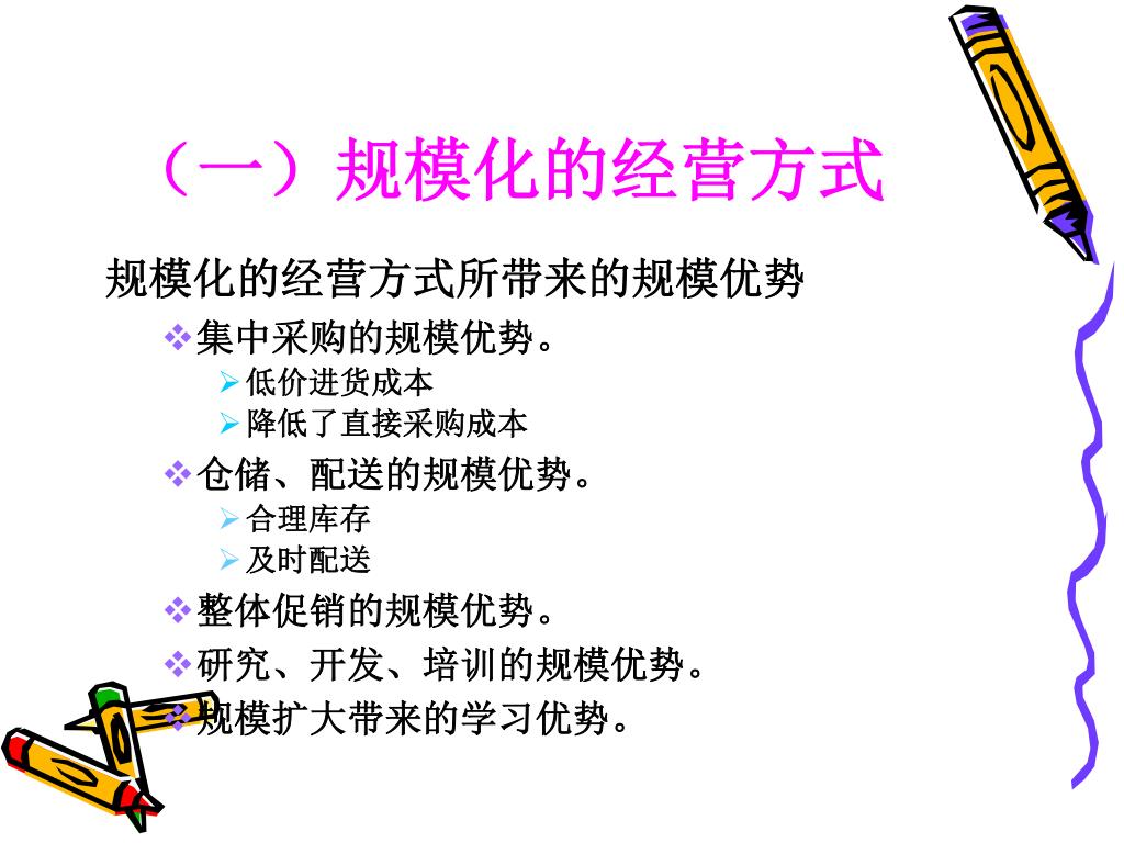 (一)规模化的经营方式 规模化的经营方式所带来的规模优势 • 集中采购的规模优势。 • 低价进货成本 • 降低了直接采购成本 • 仓储、配送的规模优势。 • 合理库存 • 及时配送 • 整体促销的规模优势。 • 研究、开发、培训的规模优势。 • 规模扩大带来的学习优势。