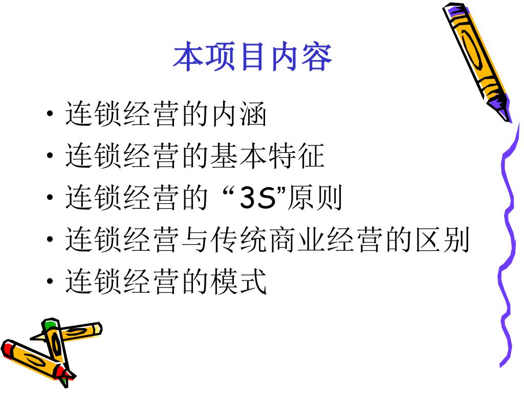 本项目内容 • 连锁经营的内涵 • 连锁经营的基本特征 • 连锁经营的“3S”原则 • 连锁经营与传统商业经营的区别 • 连锁经营的模式