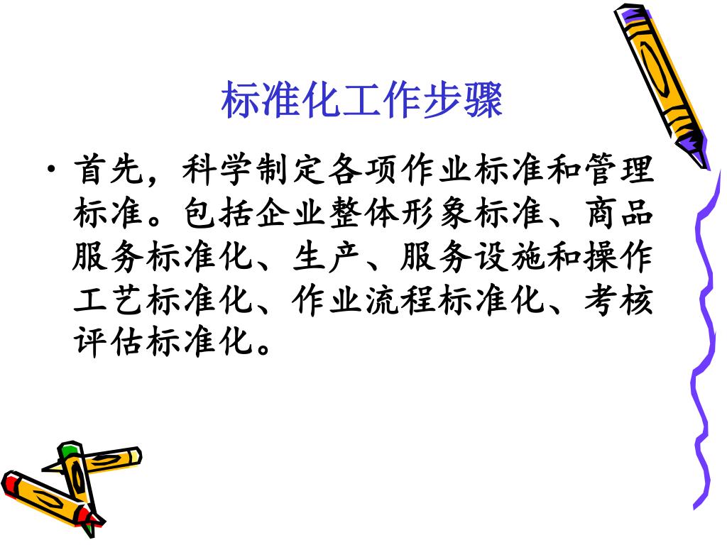标准化工作步骤 • 首先,科学制定各项作业标准和管理标准。包括企业整体形象标准、商品服务标准化、生产、服务设施和操作工艺标准化、作业流程标准化、考核评估标准化。