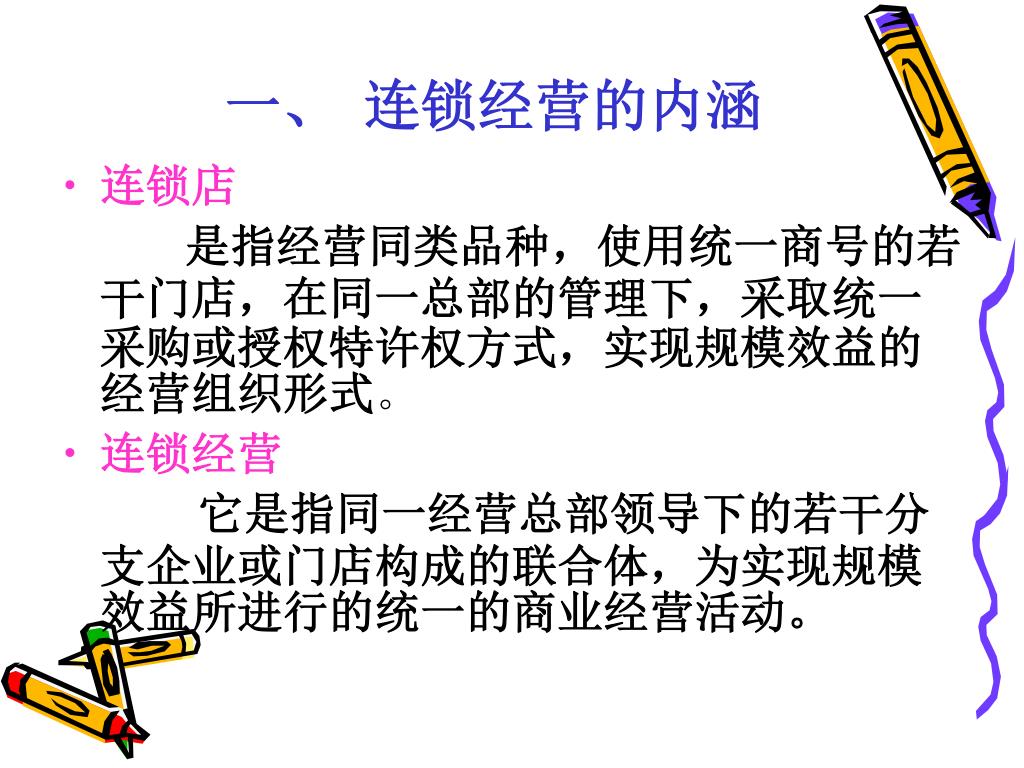 一、 连锁经营的内涵 • 连锁店 是指经营同类品种,使用统一商号的若干门店,在同一总部的管理下,采取统一采购或授权特许权方式,实现规模效益的经营组织形式。 • 连锁经营 它是指同一经营总部领导下的若干分支企业或门店构成的联合体,为实现规模效益所进行的统一的商业经营活动。