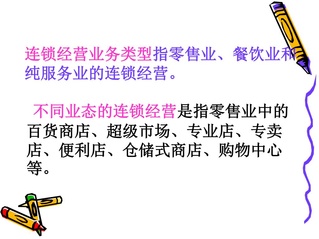 连锁经营业务类型指零售业、餐饮业和 纯服务业的连锁经营。 不同业态的连锁经营是指零售业中的百货商店、超级市场、专业店、专卖店、便利店、仓储式商店、购物中心等。