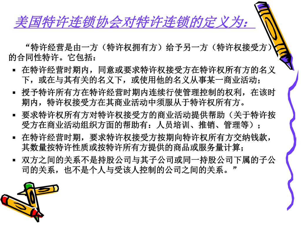 各国对特许连锁的定义 美国商务部对特许连锁的定义是: “主导企业把自己开发的商品、服务和营业系统(包括商标、商号等企业象征的使用、经营技术、营业场所和区域),以契约的形式授予加盟店在规定区域内的经销权或营业权。加盟店则交纳一定的营业权使用费,承担规定的义务。”