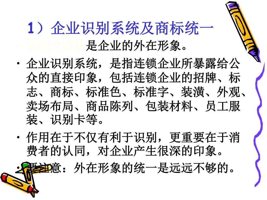1)企业识别系统及商标统一 • 系统及商标是企业的外在形象。 • 企业识别系统,是指连锁企业所暴露给公众的直接印象,包括连锁企业的招牌、标志、商标、标准色、标准字、装潢、外观、卖场布局、商品陈列、包装材料、员工服装、识别卡等。 • 作用在于不仅有利于识别,更重要在于消费者的认同,对企业产生很深的印象。 • 要注意:外在形象的统一是远远不够的。