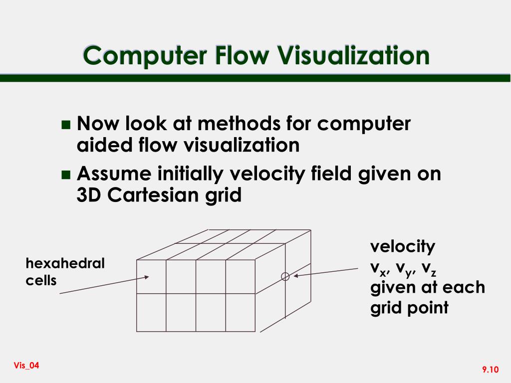 Computer Flow Visualization • Now look at methods for computer aided flow visualization • Assume initially velocity field given on 3D Cartesian grid velocity vx, vy, vz given at each grid point hexahedral cells