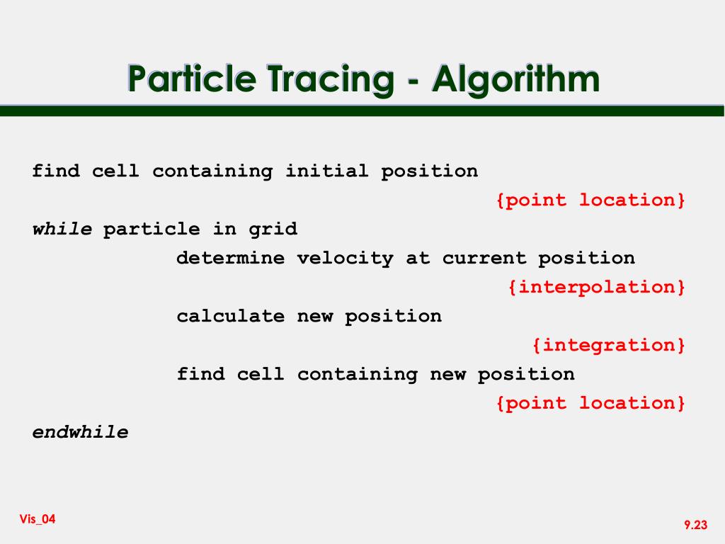 Particle Tracing - Algorithm find cell containing initial position {point location} while particle in grid determine velocity at current position {interpolation} calculate new position {integration} find cell containing new position {point location} endwhile
