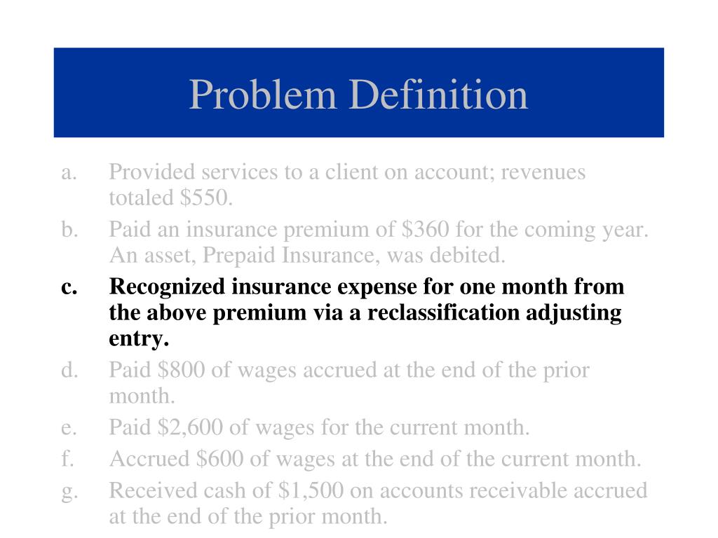 Problem Definition • Provided services to a client on account; revenues totaled $550. • Paid an insurance premium of $360 for the coming year. An asset, Prepaid Insurance, was debited. • Recognized insurance expense for one month from the above premium via a reclassification adjusting entry. • Paid $800 of wages accrued at the end of the prior month. • Paid $2,600 of wages for the current month. • Accrued $600 of wages at the end of the current month. • Received cash of $1,500 on accounts receivable accrued at the end of the prior month.
