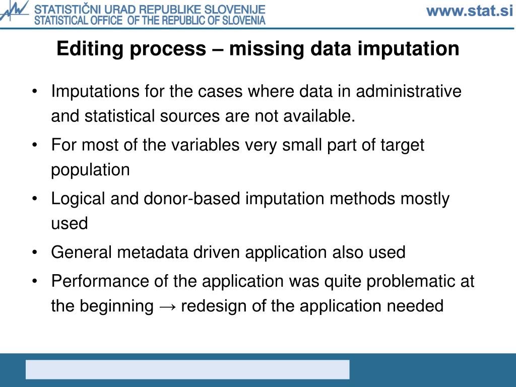 Editing process – missing data imputation • Imputations for the cases where data in administrative and statistical sources are not available. • For most of the variables very small part of target population • Logical and donor-based imputation methods mostly used • General metadata driven application also used • Performance of the application was quite problematic at the beginning → redesign of the application needed