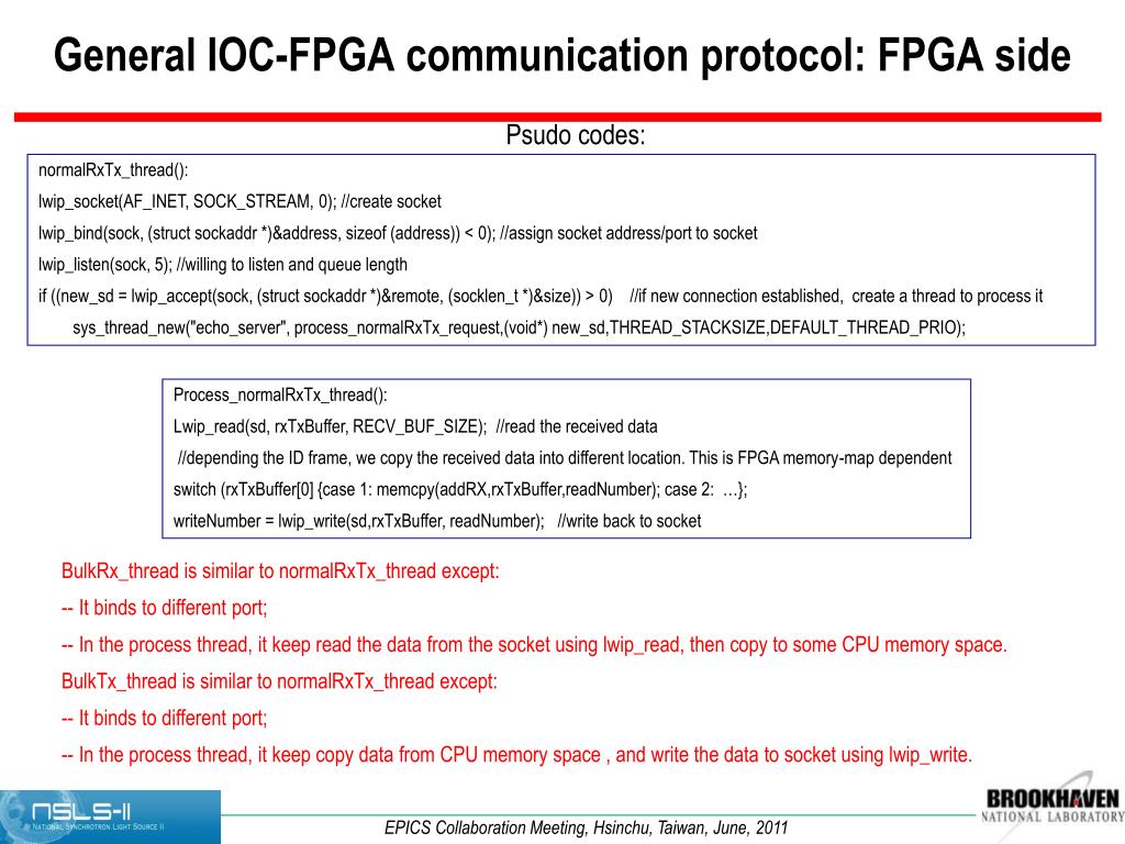 General IOC-FPGA communication protocol: FPGA side Psudo codes: normalRxTx_thread(): lwip_socket(AF_INET, SOCK_STREAM, 0); //create socket lwip_bind(sock, (struct sockaddr *)&address, sizeof (address)) < 0); //assign socket address/port to socket lwip_listen(sock, 5); //willing to listen and queue length if ((new_sd = lwip_accept(sock, (struct sockaddr *)&remote, (socklen_t *)&size)) > 0) //if new connection established, create a thread to process it sys_thread_new("echo_server", process_normalRxTx_request,(void*) new_sd,THREAD_STACKSIZE,DEFAULT_THREAD_PRIO); Process_normalRxTx_thread(): Lwip_read(sd, rxTxBuffer, RECV_BUF_SIZE); //read the received data //depending the ID frame, we copy the received data into different location. This is FPGA memory-map dependent switch (rxTxBuffer[0] {case 1: memcpy(addRX,rxTxBuffer,readNumber); case 2: …}; writeNumber = lwip_write(sd,rxTxBuffer, readNumber); //write back to socket BulkRx_thread is similar to normalRxTx_thread except: -- It binds to different port; -- In the process thread, it keep read the data from the socket using lwip_read, then copy to some CPU memory space. BulkTx_thread is similar to normalRxTx_thread except: -- It binds to different port; -- In the process thread, it keep copy data from CPU memory space , and write the data to socket using lwip_write.