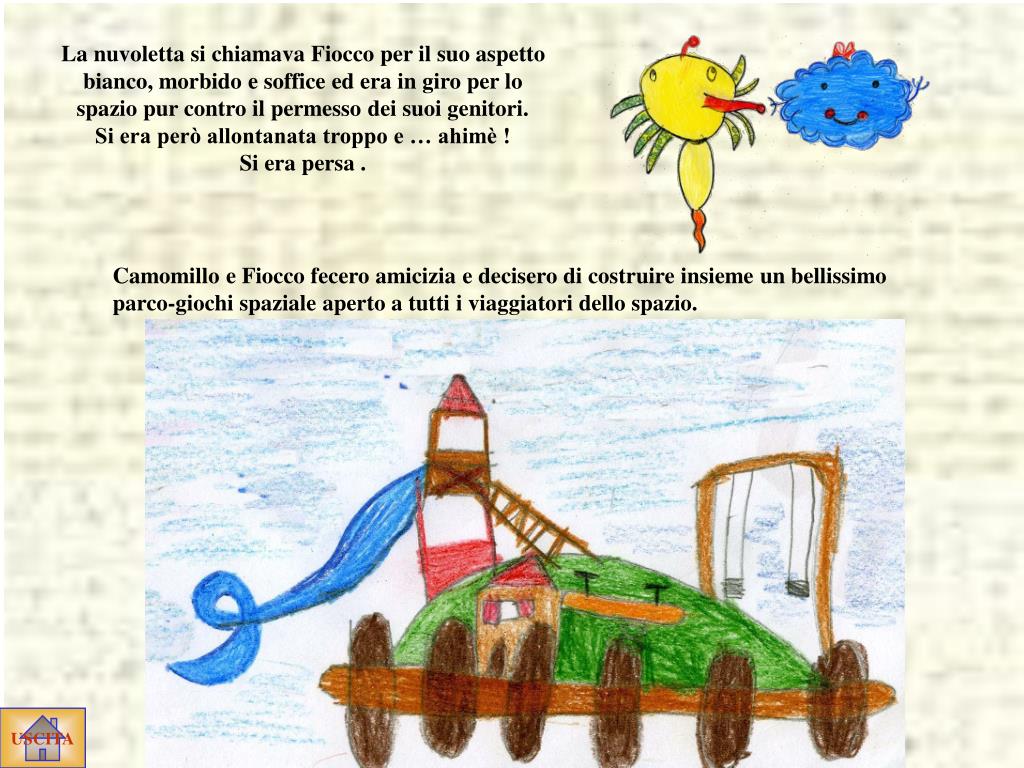 La nuvoletta si chiamava Fiocco per il suo aspetto bianco, morbido e soffice ed era in giro per lo spazio pur contro il permesso dei suoi genitori. Si era però allontanata troppo e … ahimè ! Si era persa . Camomillo e Fiocco fecero amicizia e decisero di costruire insieme un bellissimo parco-giochi spaziale aperto a tutti i viaggiatori dello spazio.