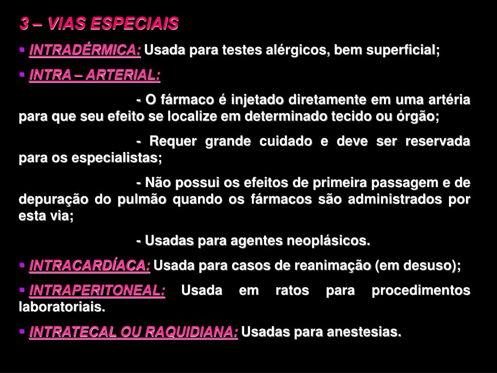 3 – VIAS ESPECIAIS • INTRADÉRMICA: Usada para testes alérgicos, bem superficial; • INTRA – ARTERIAL: - O fármaco é injetado diretamente em uma artéria para que seu efeito se localize em determinado tecido ou órgão; - Requer grande cuidado e deve ser reservada para os especialistas; - Não possui os efeitos de primeira passagem e de depuração do pulmão quando os fármacos são administrados por esta via; - Usadas para agentes neoplásicos. • INTRACARDÍACA: Usada para casos de reanimação (em desuso); • INTRAPERITONEAL: Usada em ratos para procedimentos laboratoriais. • INTRATECAL OU RAQUIDIANA: Usadas para anestesias.
