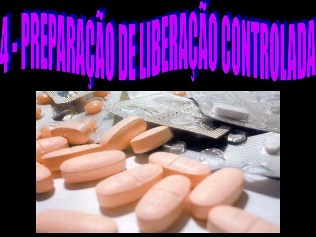 4 – PREPARAÇÃO DE LIBERAÇÃO CONTROLADA ABSORÇÃO:Lenta e uniforme do fármaco por 8 horas ou mais. • VANTAGENS • Redução na freqüência de administração do fármaco em comparação com a administração convencional. DESVANTAGENS • Pode ocorrer falha na forma farmacêutica onde haja liberação imediata do fármaco que deveria ter liberação prolongada; • Podendo provocar toxicidade em razão de a dose da droga ingerida de uma só vez, poder corresponder à várias vezes a quantidade contida na preparação convencional; • São apropriadas para fármacos com meias-vidas curtas (menos de 4 horas);