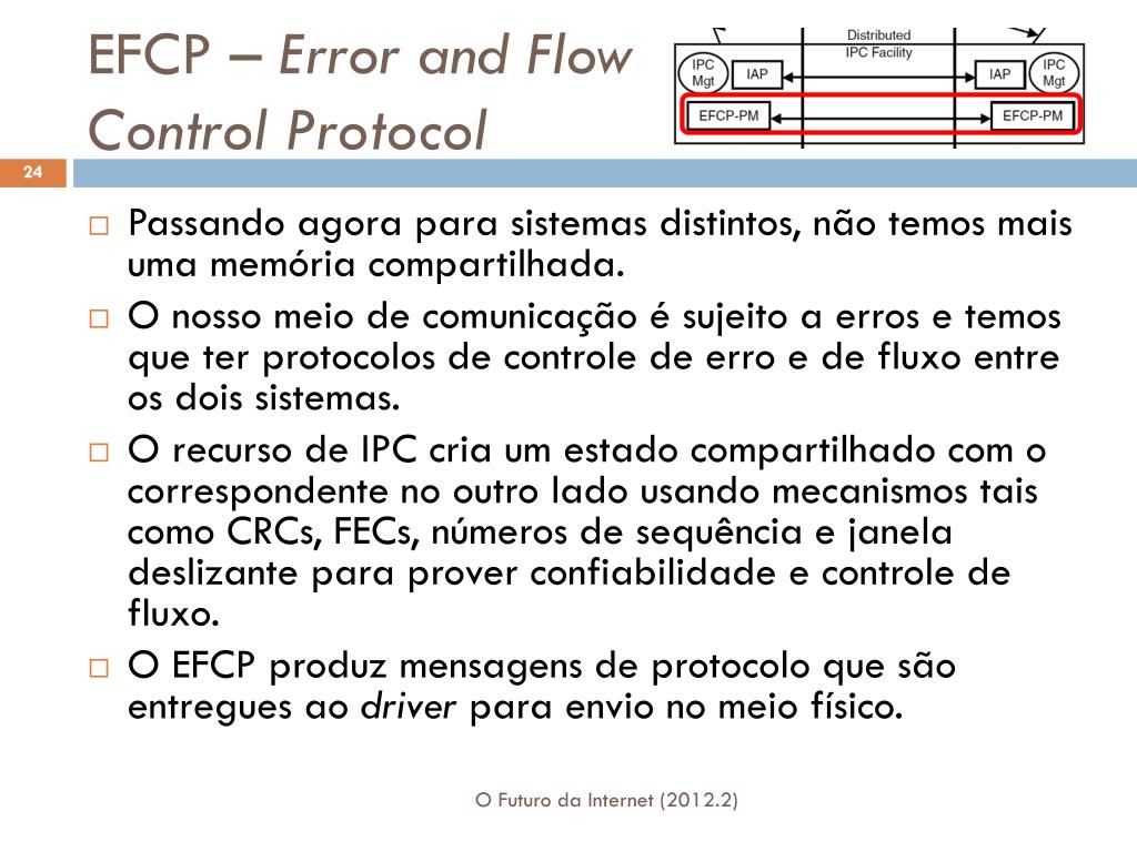 EFCP – ErrorandFlowControlProtocol • Passando agora para sistemas distintos, não temos mais uma memória compartilhada. • O nosso meio de comunicação é sujeito a erros e temos que ter protocolos de controle de erro e de fluxo entre os dois sistemas. • O recurso de IPC cria um estado compartilhado com o correspondente no outro lado usando mecanismos tais como CRCs, FECs, números de sequência e janela deslizante para prover confiabilidade e controle de fluxo. • O EFCP produz mensagens de protocolo que são entregues ao driver para envio no meio físico. O Futuro da Internet (2012.2)