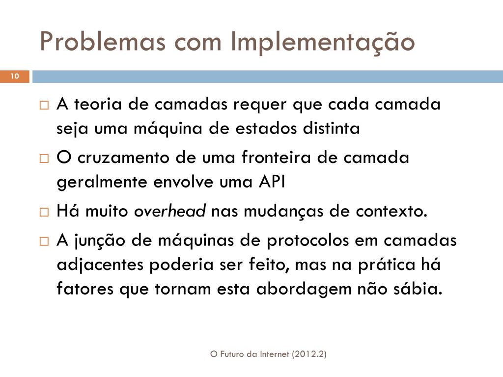 Problemas com Implementação • A teoria de camadas requer que cada camada seja uma máquina de estados distinta • O cruzamento de uma fronteira de camada geralmente envolve uma API • Há muito overhead nas mudanças de contexto. • A junção de máquinas de protocolos em camadas adjacentes poderia ser feito, mas na prática há fatores que tornam esta abordagem não sábia. O Futuro da Internet (2012.2)