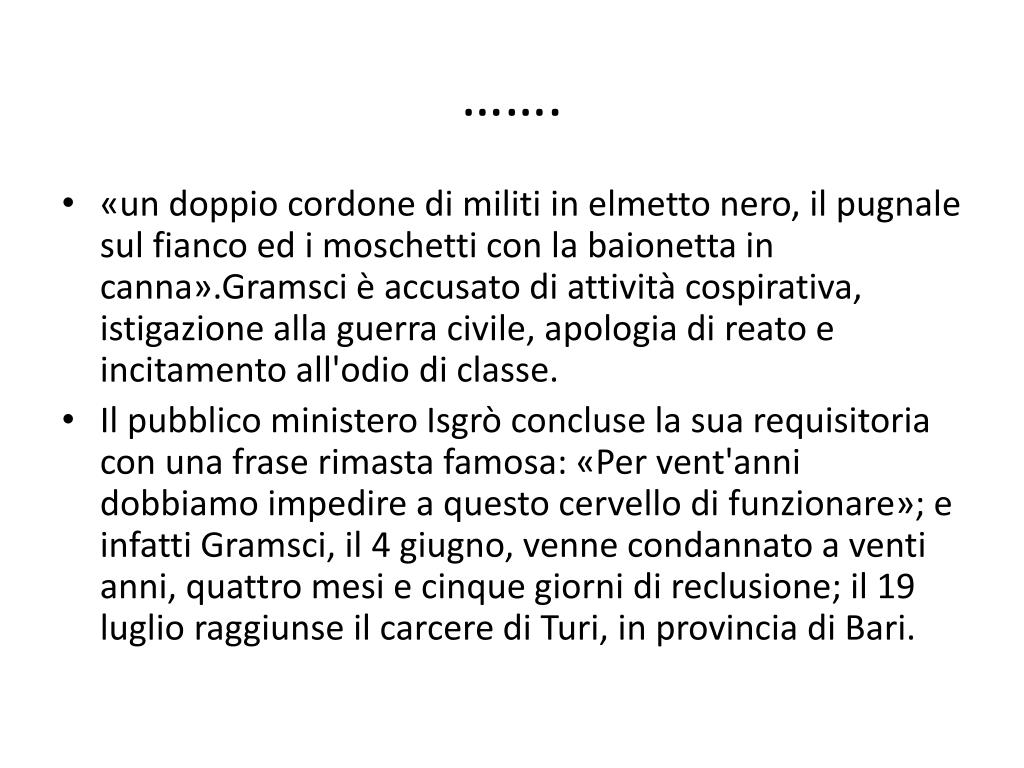 ……. • «un doppio cordone di militi in elmetto nero, il pugnale sul fianco ed i moschetti con la baionetta in canna».Gramsci è accusato di attività cospirativa, istigazione alla guerra civile, apologia di reato e incitamento all'odio di classe. • Il pubblico ministero Isgrò concluse la sua requisitoria con una frase rimasta famosa: «Per vent'anni dobbiamo impedire a questo cervello di funzionare»; e infatti Gramsci, il 4 giugno, venne condannato a venti anni, quattro mesi e cinque giorni di reclusione; il 19 luglio raggiunse il carcere di Turi, in provincia di Bari.
