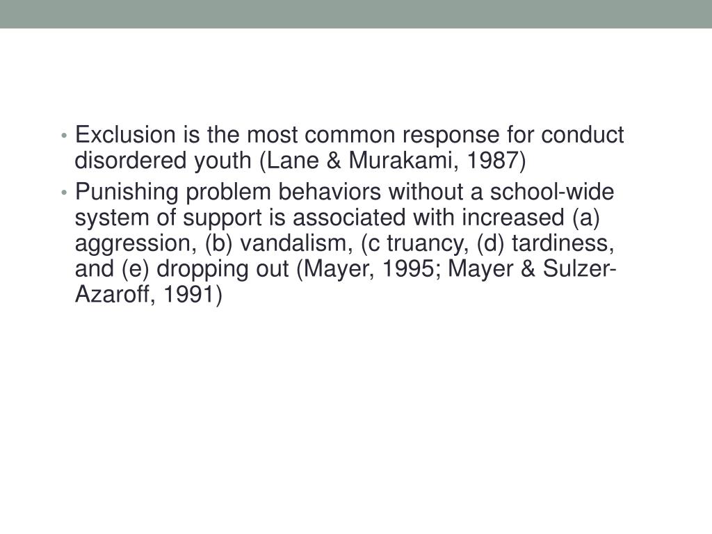 Exclusion is the most common response for conduct disordered youth (Lane & Murakami, 1987) • Punishing problem behaviors without a school-wide system of support is associated with increased (a) aggression, (b) vandalism, (c truancy, (d) tardiness, and (e) dropping out (Mayer, 1995; Mayer & Sulzer-Azaroff, 1991)