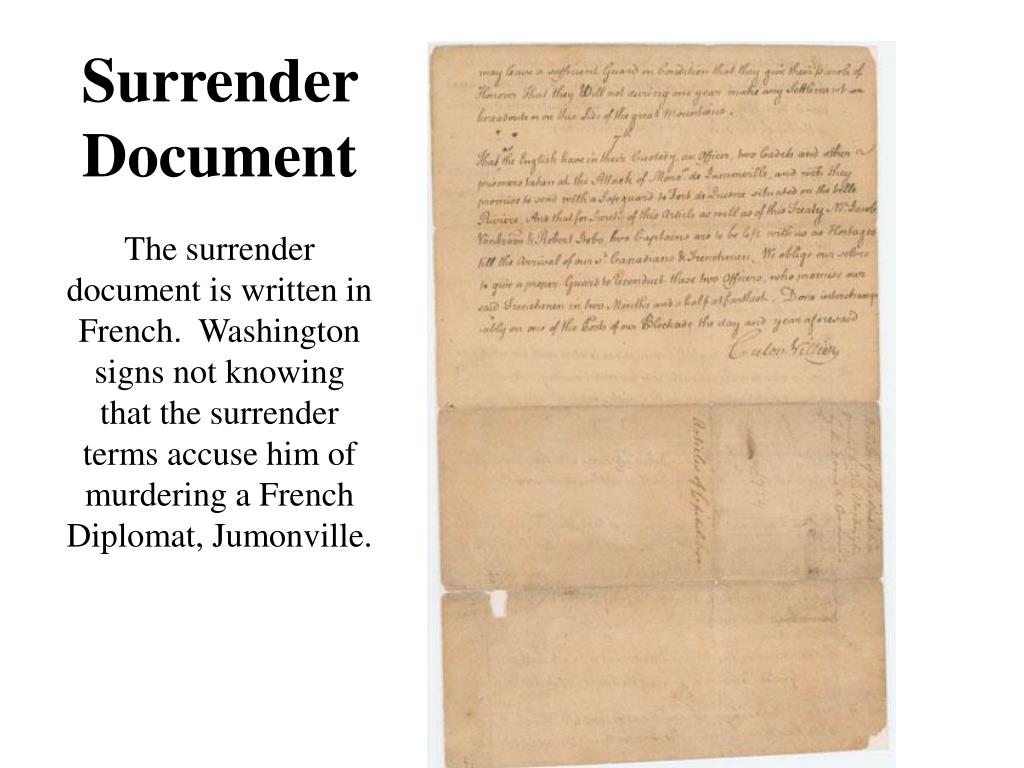 Surrender Document The surrender document is written in French. Washington signs not knowing that the surrender terms accuse him of murdering a French Diplomat, Jumonville.