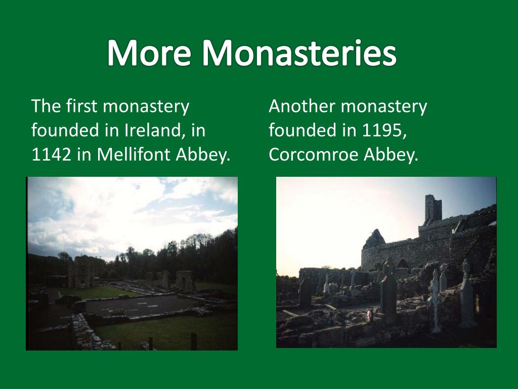 More Monasteries Another monasteryfounded in 1195, CorcomroeAbbey. The first monastery founded in Ireland, in 1142 in MellifontAbbey.