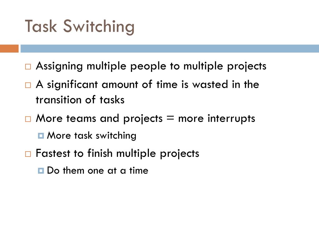 Task Switching • Assigning multiple people to multiple projects • A significant amount of time is wasted in the transition of tasks • More teams and projects = more interrupts • More task switching • Fastest to finish multiple projects • Do them one at a time
