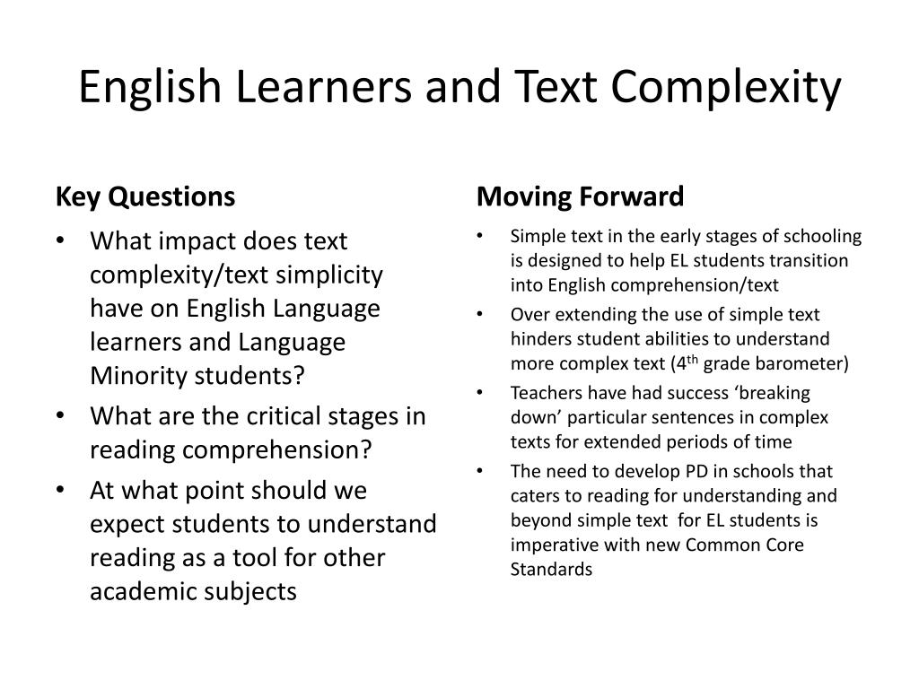 English Learners and Text Complexity Key Questions Moving Forward Simple text in the early stages of schooling is designed to help EL students transition into English comprehension/text Over extending the use of simple text hinders student abilities to understand more complex text (4th grade barometer) Teachers have had success ‘breaking down’ particular sentences in complex texts for extended periods of time The need to develop PD in schools that caters to reading for understanding and beyond simple text for EL students is imperative with new Common Core Standards • What impact does text complexity/text simplicity have on English Language learners and Language Minority students? • What are the critical stages in reading comprehension? • At what point should we expect students to understand reading as a tool for other academic subjects